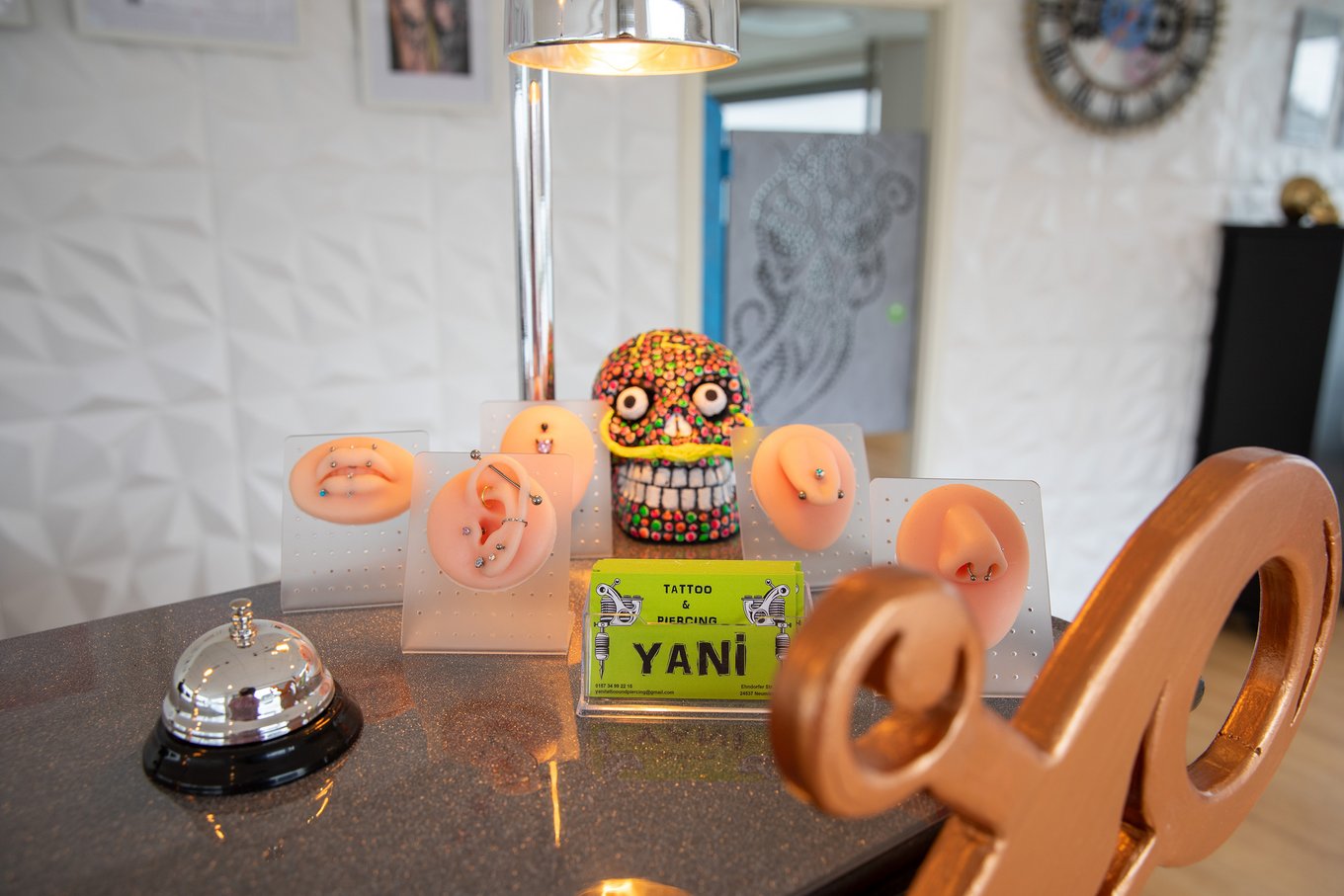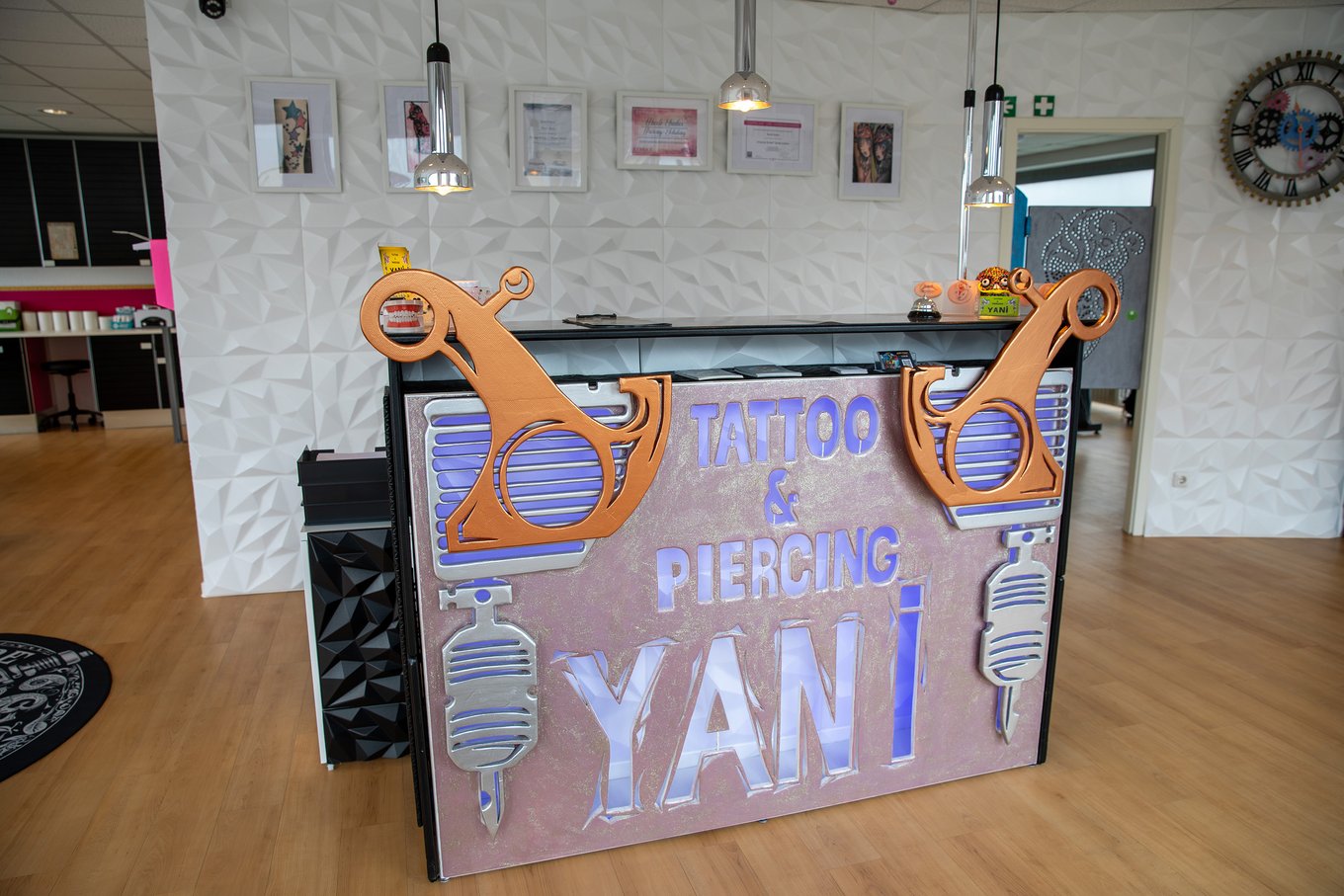 Dunkle Hinterzimmer oder wortkarge Typen mit Totenkopf-Shirt – mit diesen Klischees hat das Studio YANI in der Ehndorfer Straße nichts gemein. Stattdessen flutet Sonnenlicht durch große Fenster in einen offenen Raum. „Wir wollten einen einladenden Ort schaffen, der Berührungsängste abbaut“, erklärt Nicole. Ihr Partner Yalin hat als gelernter Schlosser fast die gesamte Einrichtung selbst gebaut – vom auffälligen Empfangstresen bis zum lederbezogenen Tisch im Wartebereich.